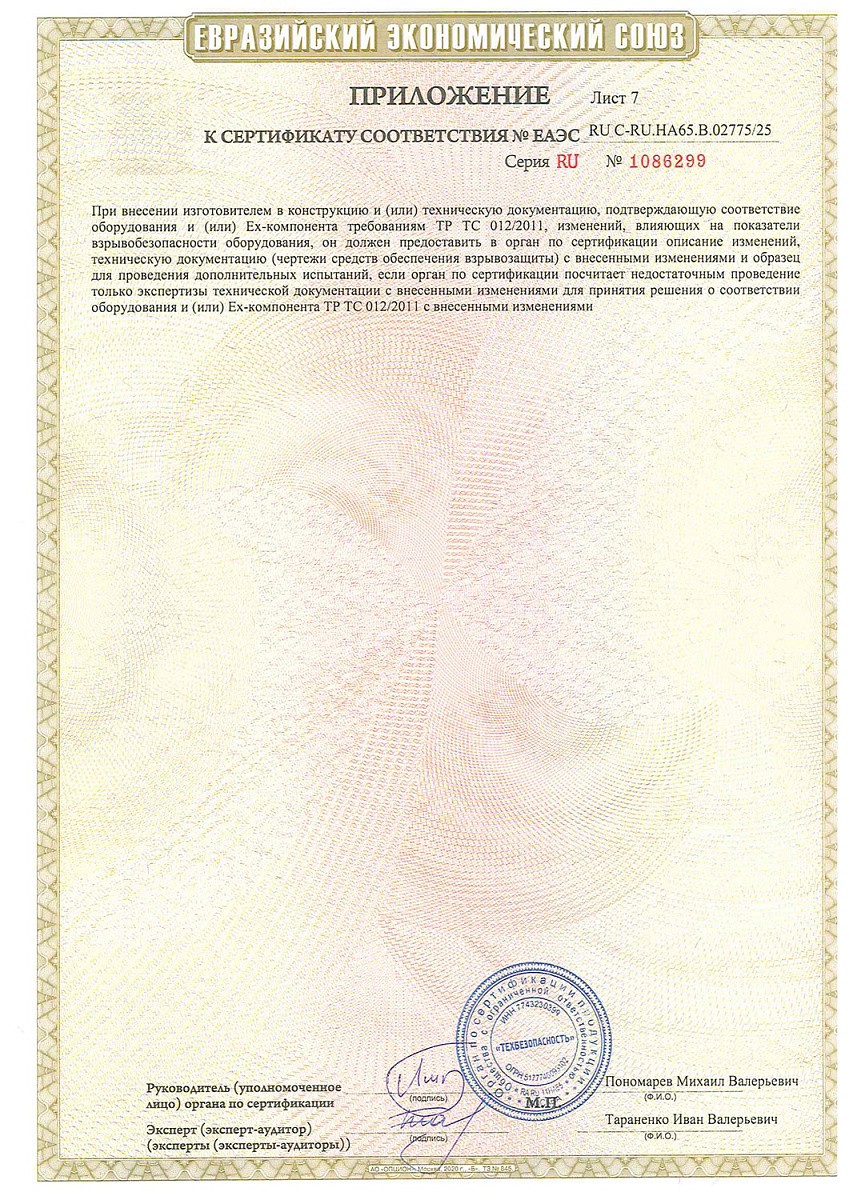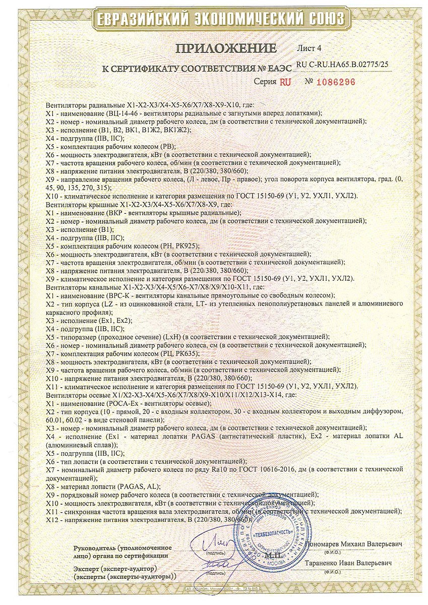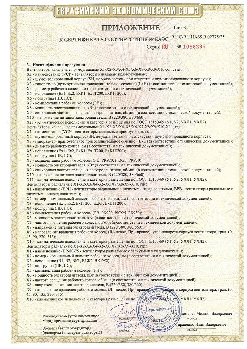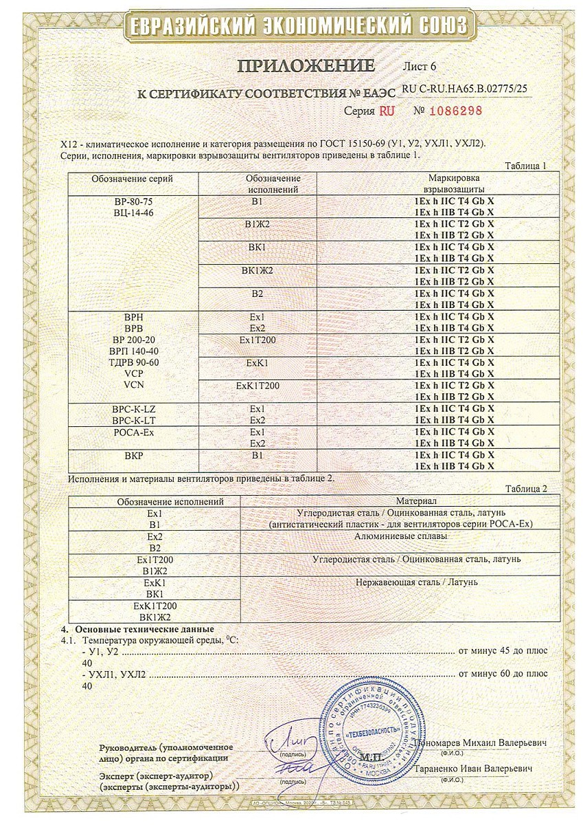 Сертификат соответствия о работе во взрывоопасных средах на взрывозащищенные вентиляторы (ТР ТС 012/2011)